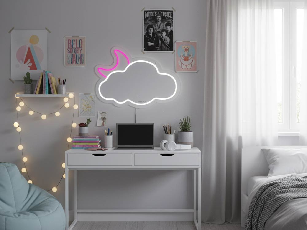 Add a touch of magic to your space with this cloud-shaped LED wall mirror. It glows with a bright white neon light and features a pink moon emerging from behind it. The vibrant neon light creates a striking atmosphere, while the pink moon adds a playful splash of colour and a touch of whimsy. Lightweight and easy to hang, this charming pair combines powerful lighting with a dreamy design — perfect for bedrooms, children’s rooms or any cosy corner in need of a distinctive glow.