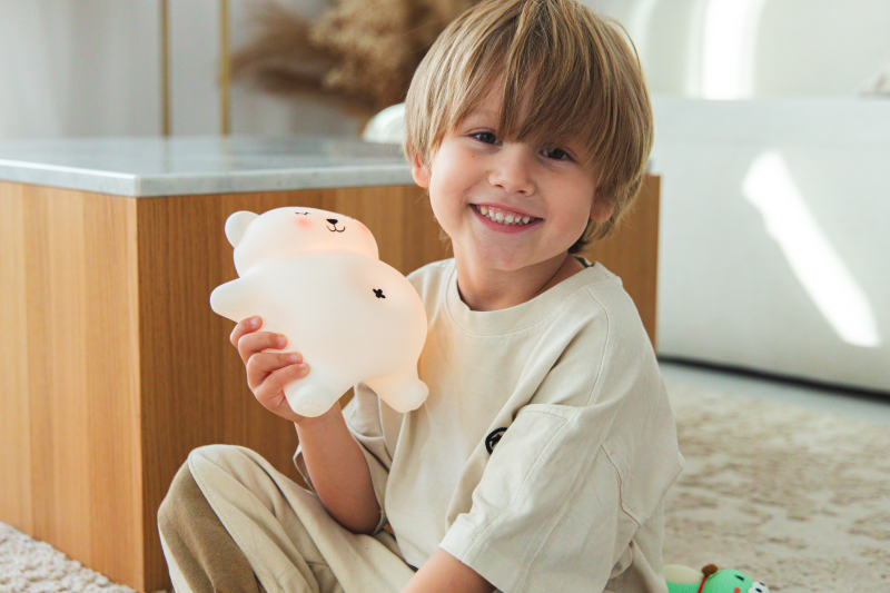 Snuggle up with your new sleep companion: an adorable white bear that glows and snores softly! This charming little bear glows gently to create a calm and cosy atmosphere that is perfect for sleep. With three soothing light settings, you can easily switch from a warm, soft glow to a brighter light at the touch of a button. Activate the gentle snoring sound and observe the lamp’s soft breathing, as if it were peacefully sleeping beside you. Made of soft, safe silicone and conveniently charged via USB, it’s perfect for children and adults who love having a comforting companion at night. More than just a lamp, this sleeping bear brings warmth, tranquillity and sweet dreams to every evening.